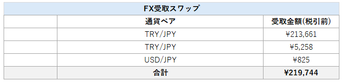 トルコリラの月間スワップ合計が約¥270,000、メキシコペソが¥13,500となっています。