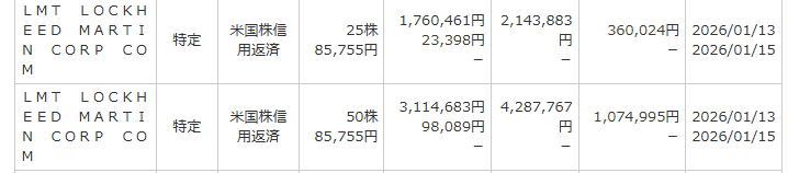 LMT LOCKHEED MARTIN CORP特定米国株信用返済50株85,755円 / 1,074,995円3,114,683円4,287,767円2026/01/13 / 2026/01/15